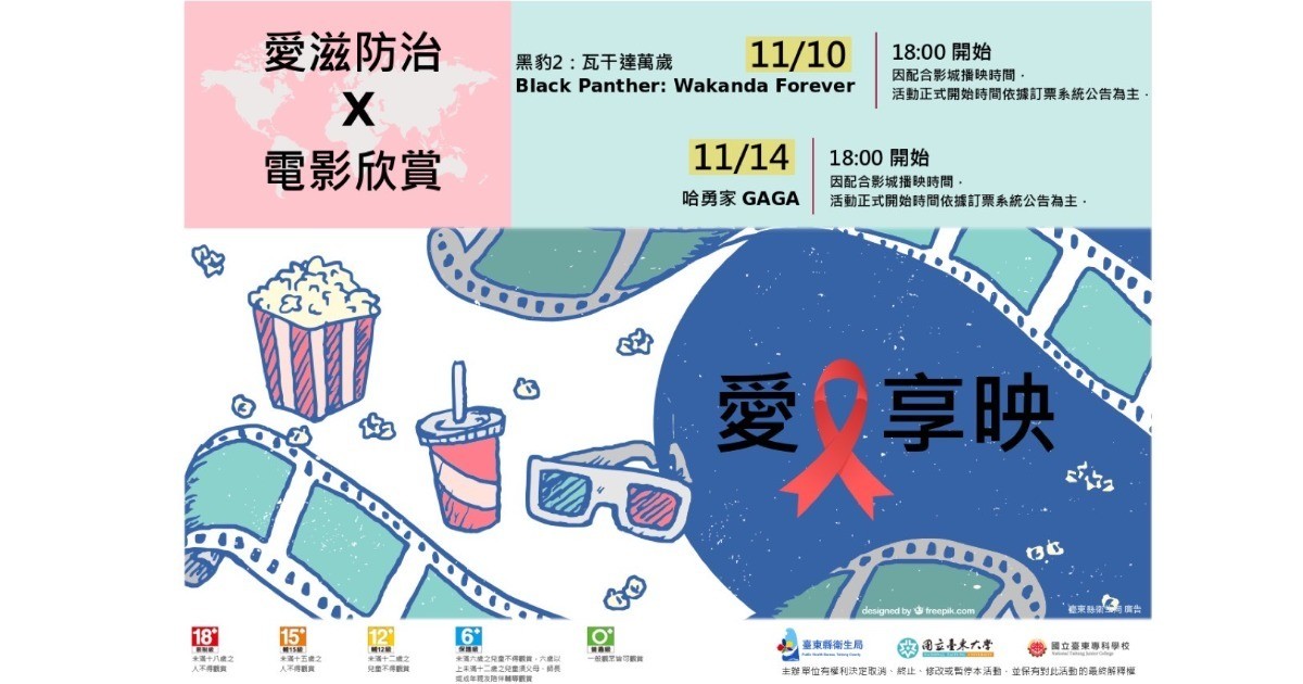 7. 本活動為愛滋病及性病防治衛教宣導搭配電影欣賞,部分場次電影為輔導級以上,請確認是否符合年齡規定。